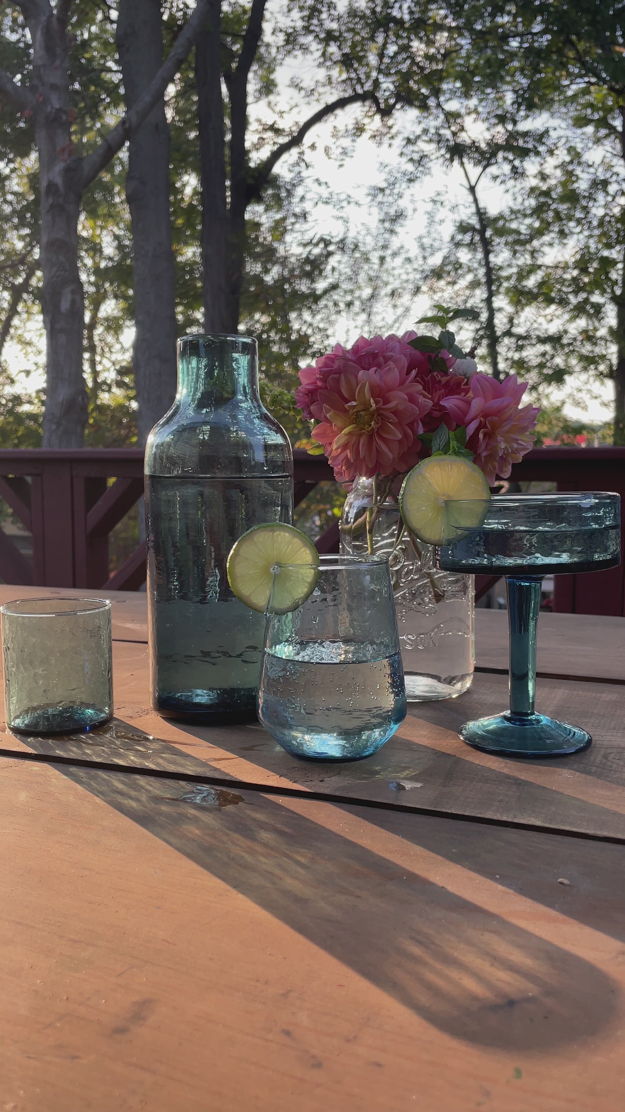 Form meets function in these stunning glass carafes. Each is handblown from recycled glass then meticulously hammered by hand for a truly unique finish. The set includes a carafe and lid that doubles as a small drinking glass.